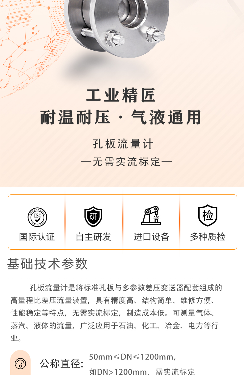 孔板流量計是將標準孔板與多參數差壓變送器配套組成的高量程比差壓流量裝置,具有精度高、結構簡單、維修方便性能穩定等特點,無需實流標定,制造成本低??蓽y量氣體蒸汽、液體的流量,廣泛應用于石油、化工、冶金、電力等行業